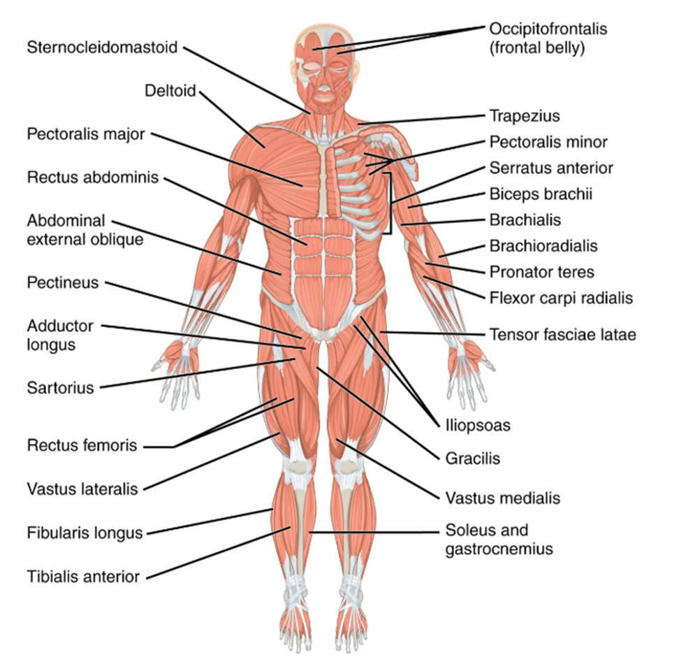 1. Assign the letters (A–M) to the corresponding muscles of the shoulder, thorax, and abdomen shown below.